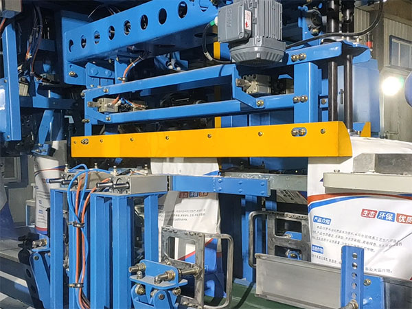 4.包裝機下料灌裝的過程中,底部的拍袋裝置啟動,確保袋內(nèi)物料充填緊密。灌裝結(jié)束后拍打停止,下料口夾袋裝置打開,充填物料后的包裝袋在下料口放下的同時,由送包小車經(jīng)專門加工的用于粉體、顆粒物料料袋的抱包、夾包裝置將料袋中部抱住,袋口夾住,送至活動導(dǎo)入裝置,活動導(dǎo)入與縫包一體機系統(tǒng)相連。經(jīng)其進入封口傳動鏈中,保證袋口成一字形。在導(dǎo)入器附近增加吸塵口,通過與除塵系統(tǒng)連接可吸走夾住袋口時飛出的粉塵.。