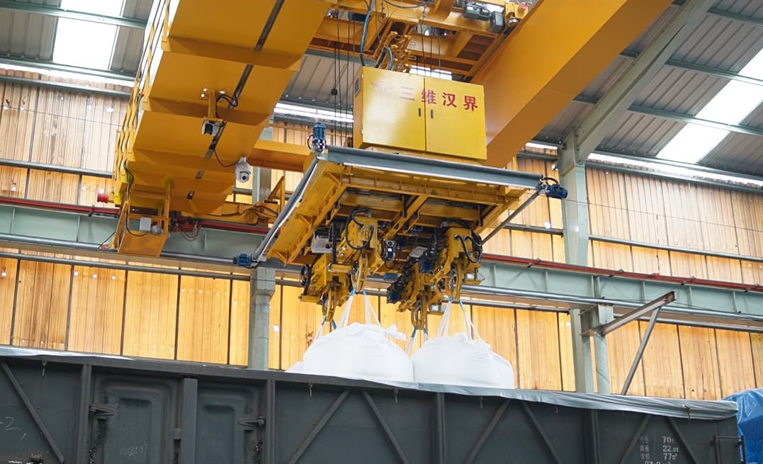 - 機械執(zhí)行:輸送機將噸袋送至抓取工位,吊裝系統(tǒng)按預(yù)設(shè)程序精準抓取并碼放至車廂指定位置,叉齒設(shè)計可保護噸袋并整形垛型。